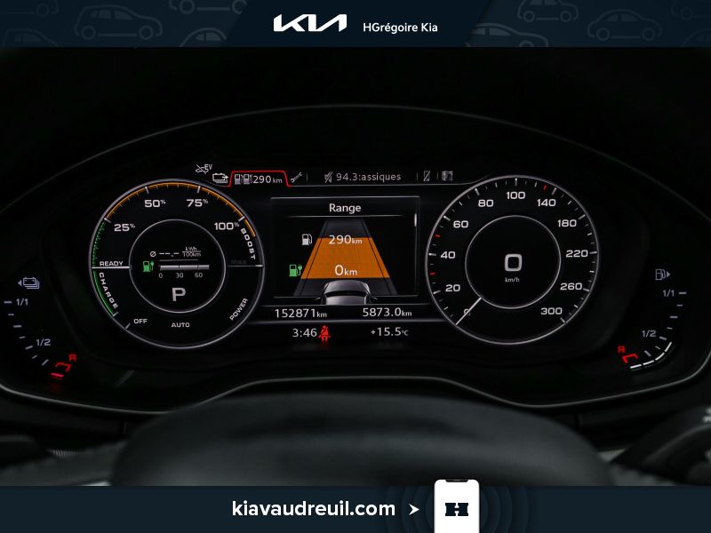 Instruments -comprend : indicateur de vitesse, odomètre, tachymètre, niveau de charge de la batterie de traction, consommation et récupération d’énergie, compteur journalier et ordinateur de voyage