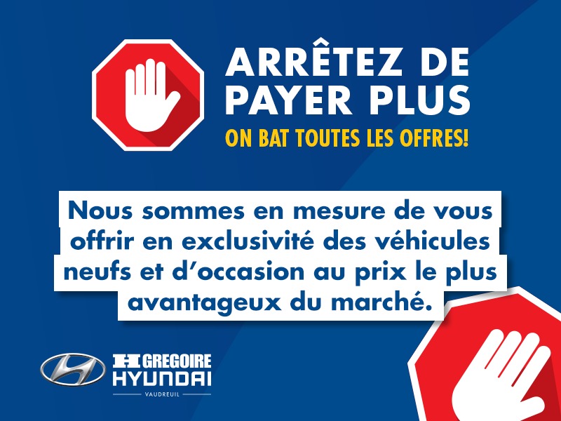 CERTIFIÉ BAS KILOMÉTRAGE, Caméra de recul, Ensemble audio premium, Système de navigation, Bluetooth, Sièges Chauffants Restez a la maison - ACHAT 100% EN LIGNE grace a HGregoire Hyundai. Vous trouverez le VEHICULE dont vous revez a un PRIX COMPÉTITIF. Nos offres exclusives sont disponibles a des taux de financement avantageux. De plus, comme nous faisons partie du Groupe HGregoire, nous vous garantissons la MEILLEURE OFFRE pour votre vehicule d'echange, peu importe le modele. Faites vous plaisir des AUJOURD'HUI. Votre vehicule vous attend chez HGregoire Hyundai! Cette offre comprend tous les rabais applicables. Transport et preparation non inclus. https://www.hyundaivaudreuil.com/fr-stk/YA735 - CERTIFIED LOW MILEAGE, Back-Up Camera, Premium audio, Bluetooth, Heated Seats Stay at home - BUY YOUR VEHICLE 100% ONLINE with HGregoire Hyundai. You will find the VEHICLE of your dreams at a COMPETITIVE PRICE. Our exclusive offers are available at advantageous financing rates. Moreover, since we are part of the HGregoire Group, we guarantee you the BEST OFFER for your trade-in vehicle, regardless of the model. Please yourself TODAY. Your vehicle is waiting for you at HGregoire Hyundai! This offer includes all applicable discounts. Transportation and preparation not included. https://www.hyundaivaudreuil.com/en-stk/YA735